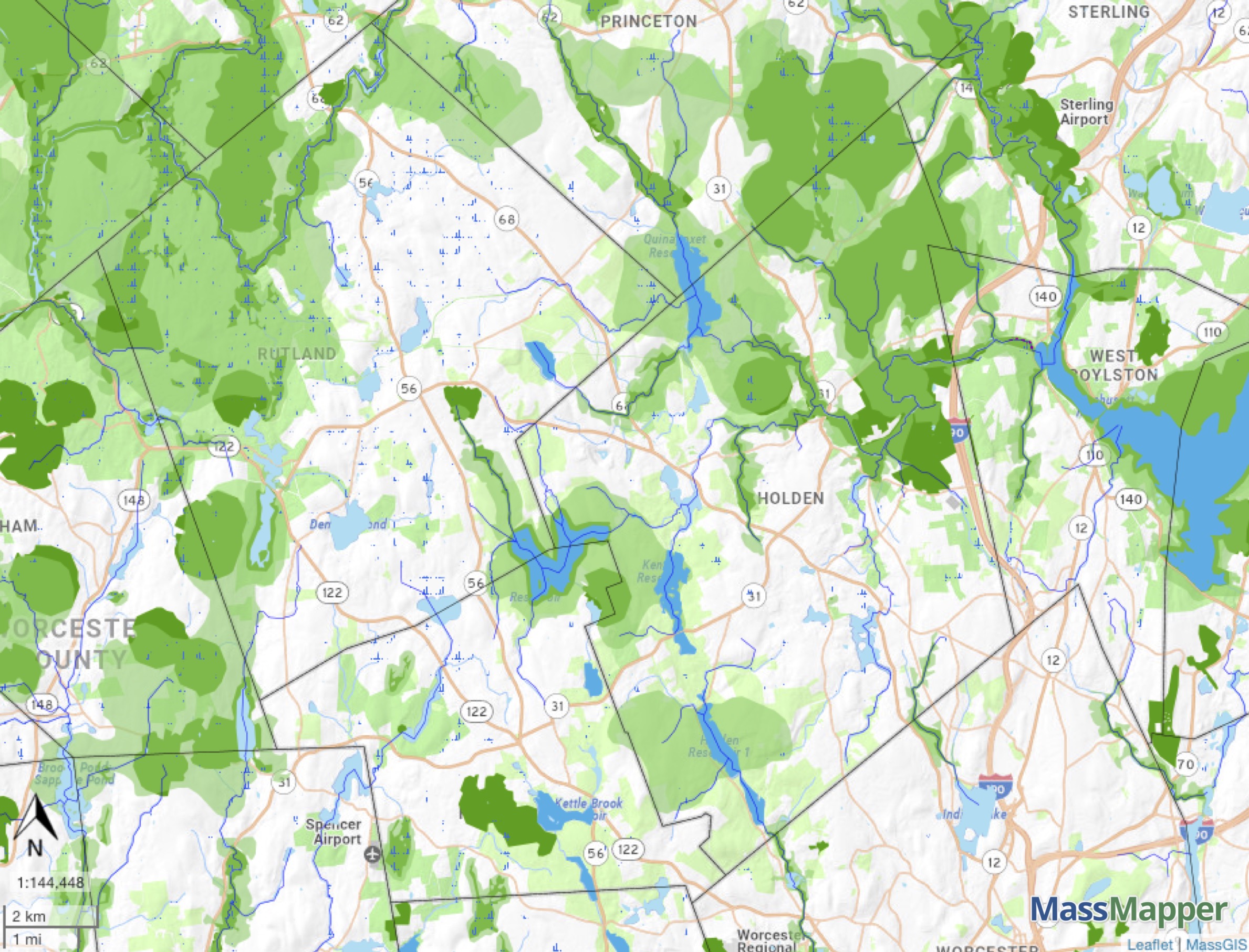 For some years Natural Heritage, a State agency, has been mapping the habitats of all wildlife that can be found in Massachusetts. From the maps of individual species they have determined areas that are important for the maintenance of wildlife, and which if developed further would probably lead to significant loss of biodiversity. The core habitats (in dark green) are areas which contain the habitats of rare plants and animals, and are viable communities, deserving the highest degree of protection. The lighter green areas depict supporting natural landscape, which is almost as important as core habitat, providing support for species in the core and acting both as links between core habitats and as buffer zones. Blue shows lakes, ponds and streams, and dark blue shows streams that are important to coldwater fish. Holden, Rutland and adjacent towns all contain areas of great importance to wildlife.