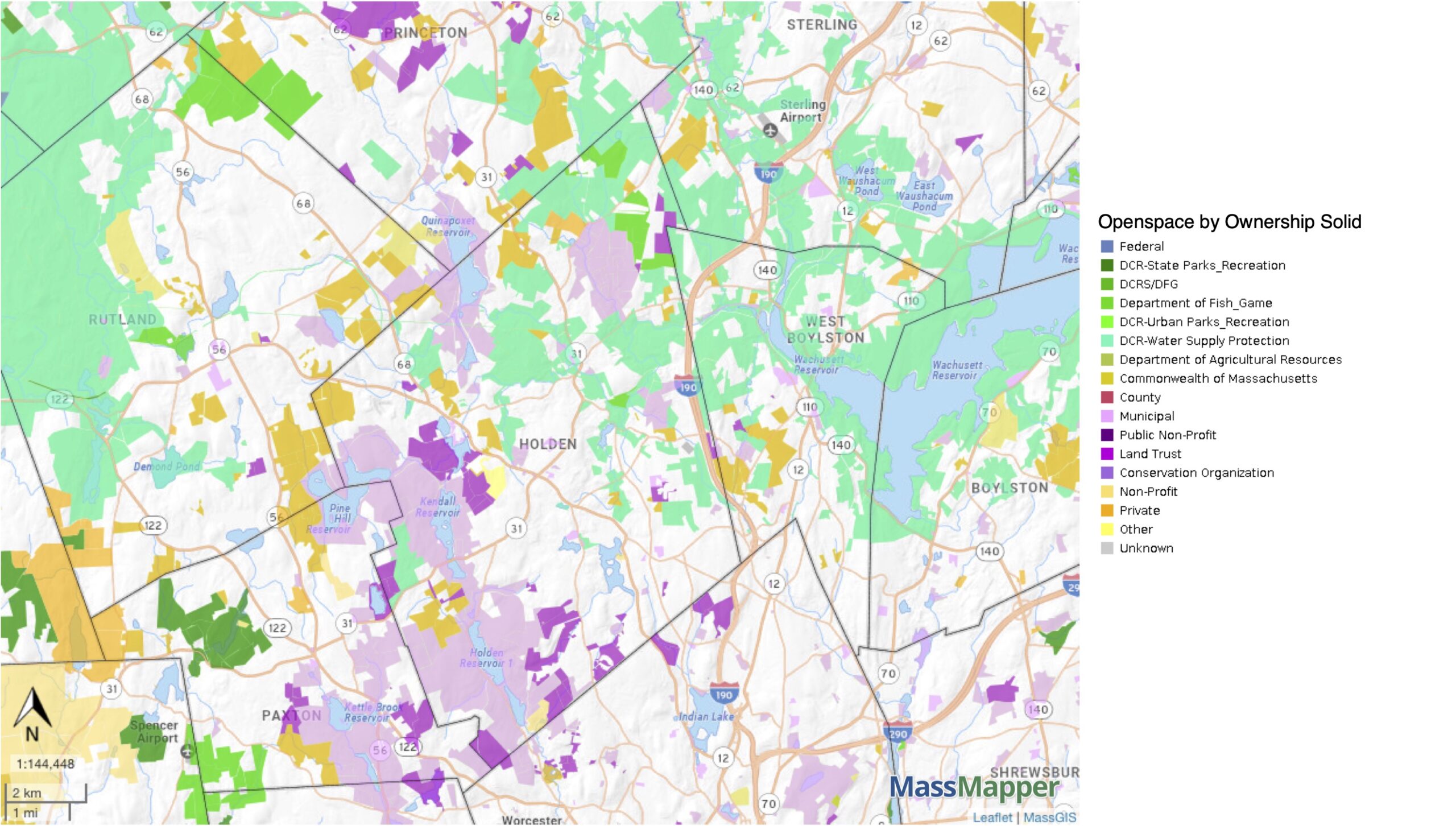 Holden is the diamond shaped outline in the center. The light mauve areas (municipal in the key) are mostly owned by the Worcester Water Authority, as catchments for the reservoirs. Most of the green is owned by the MDC (Metropolitan District Commission). Land owned by White Oak and other land trusts is shown in magenta.